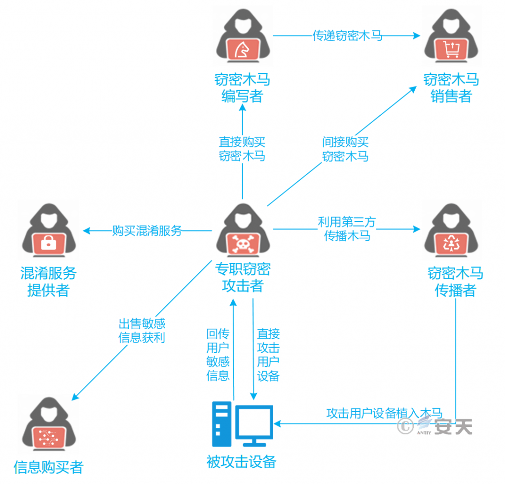 At present, commercial secret-stealing Trojan has formed a complete chain of secret-stealing industry, mainly including production, confusion, sales, dissemination, profit-making and other links. Division of labor and cooperation in the industrial chain is clear: The stealthy Trojan writer is responsible for program design, development and testing; the obfuscation service provider is responsible for obfuscating the program to avoid testing; the seller is responsible for promotion and sales to obtain more benefits; The propagator is responsible for placing a secret Trojan to infect the user’s device. The theft attacker can realize a “one-stop” type of complete attack by buying the services of each attack stage in the theft industry chain, and finally sell the stolen data to the information buyer to make a profit.