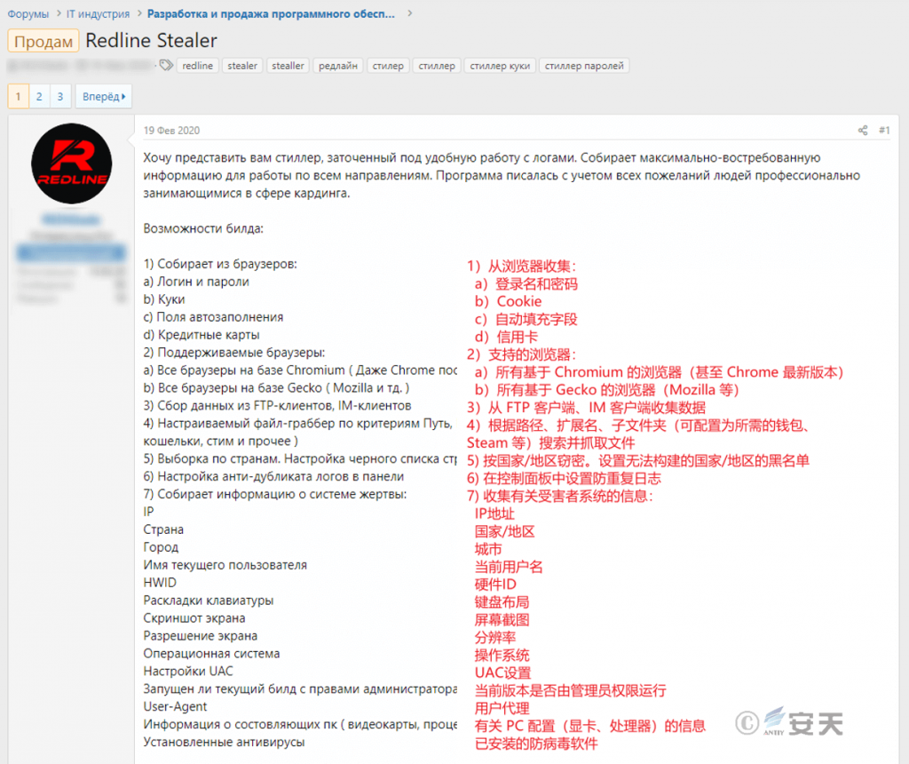 The following is the page where the RedLine espionage Trojan is for sale on a hacker forum.