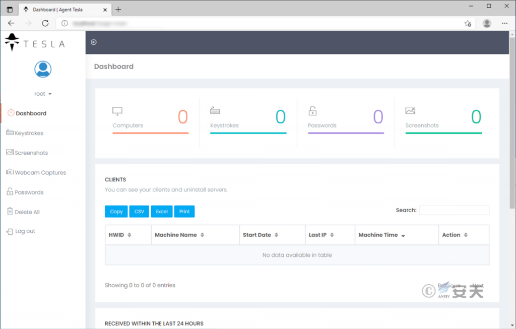 The attacker drops a secret Trojan horse, waiting for the information to be returned. The following is the control panel of the Agent Tesla Trojan horse, in which the statistical information of the victim is displayed and the function of exporting the information is provided.