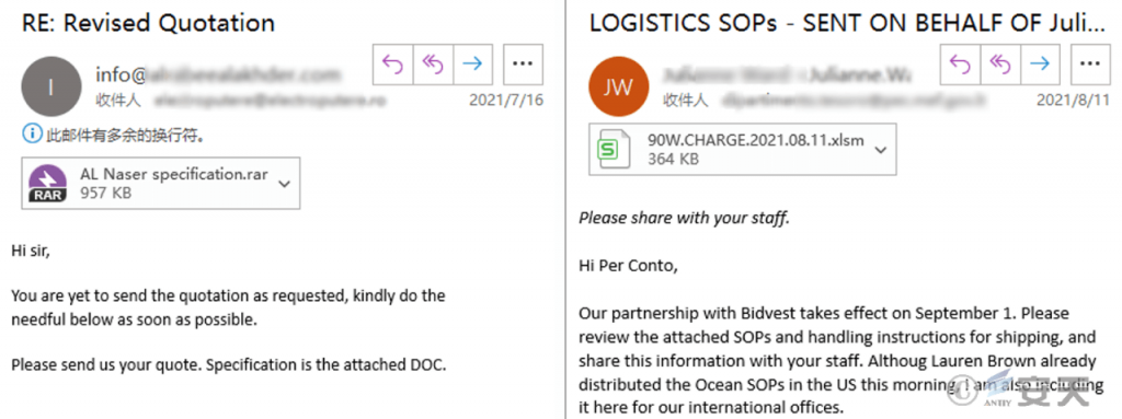 The attacker uses the content that the user is interested in as bait, sends a large number of phishing emails with attachments such as macro documents, Office vulnerability utilization documents, and malicious program compression packages, and induces the user to execute malicious code. examples of phishing emails are as follows.