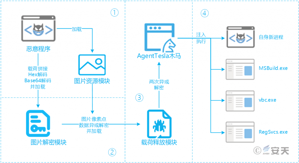 Espionage Trojan uses multi-layer attack load to nest load, and each layer load in memory with different obfuscating means to avoid security software detection. For example, the Agent Tesla Trojan uses 4 layers of load [3], and the obfuscation means at each layer include load division, Base64 encoding, exclusive OR encryption, picture steganography, loading in memory, and injection execution. the execution flow is shown as follows:[3]