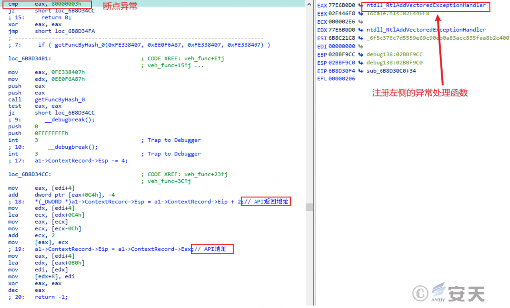 By registering custom exception handling functions, the secret Trojan horse disrupts the normal execution flow and destroys the debugger function, thus countering the analysis. For example, the Dridex Trojan registers VEH exception handling function, catches the exception triggered by int 3 instruction, and realizes the effect of indirectly calling API and anti-debugging.