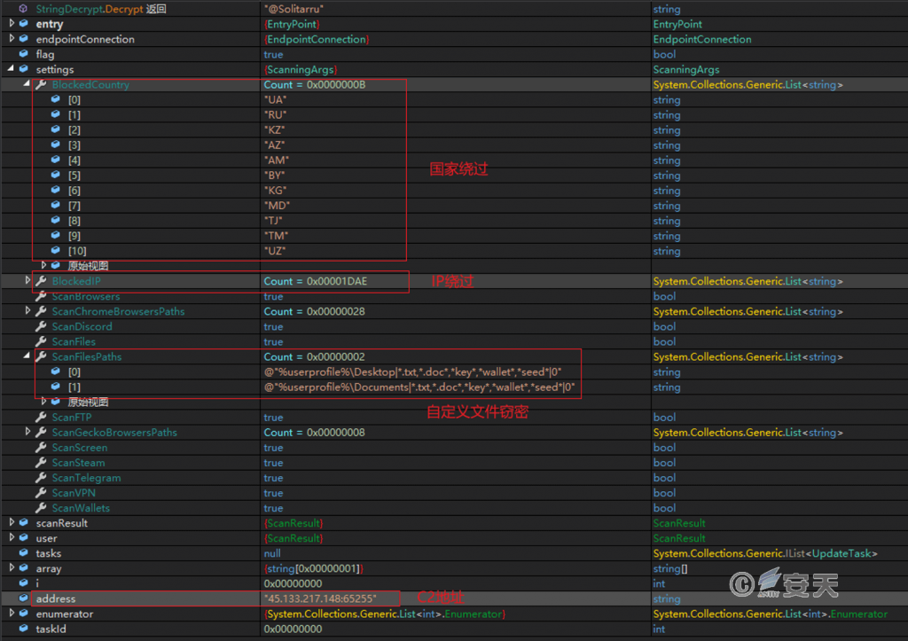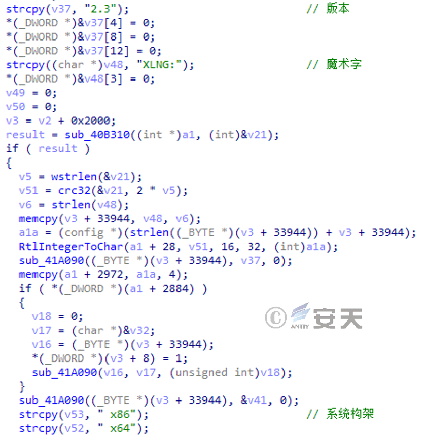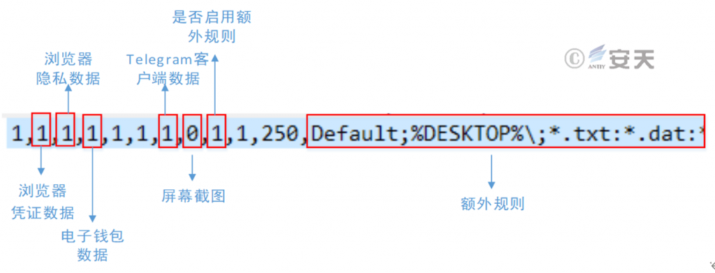 Connect to C2 to obtain configuration information, including country and region blacklist, IP blacklist, password-stealing function switch, and designated file collection rules.