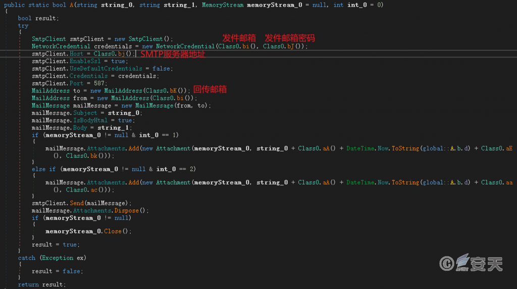 The supported return methods include email, FTP, HTTP and Tor anonymous network. the attacker can select any one of these methods and hard-code the relevant parameters into the sample to realize the return.