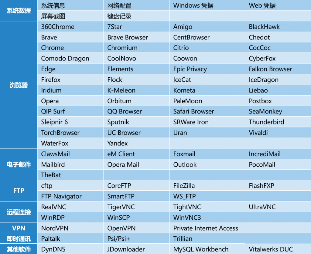 Data theft affects system data, browsers, e-mail, FTP, remote connection tools, VPN accounts, instant messaging software and server operation and maintenance tools, as shown in the table below:
