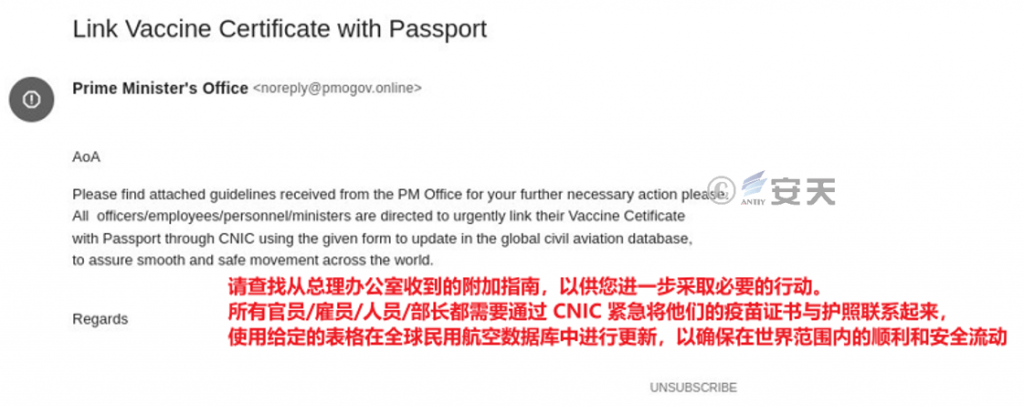 In this attack, the attackers mainly deliver spear-phishing mail to the target in the name of the Pakistani government staff, and the contents of the phishing mail are mostly related to the Pakistani government, for example, In the name of the Prime Minister’s Office of Pakistan, government staff were requested to update the status of COVID-19 vaccination.