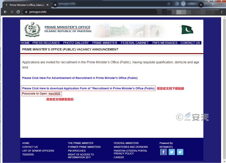 At present, the attack has attracted the attention of relevant departments of the Pakistani government, including the National Telecommunications and Information Technology Security Board (NTISB) of Pakistan, which has repeatedly issued warnings of national cyber threats [2] [3]. It said the attackers were sending fake phishing emails to government officials and the public that mimicked the office of the Pakistani prime minister, and asked government officials and the public to remain vigilant. Do not provide any information via email and social media links.