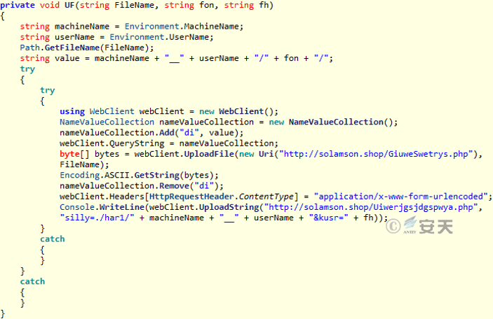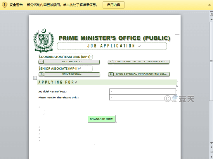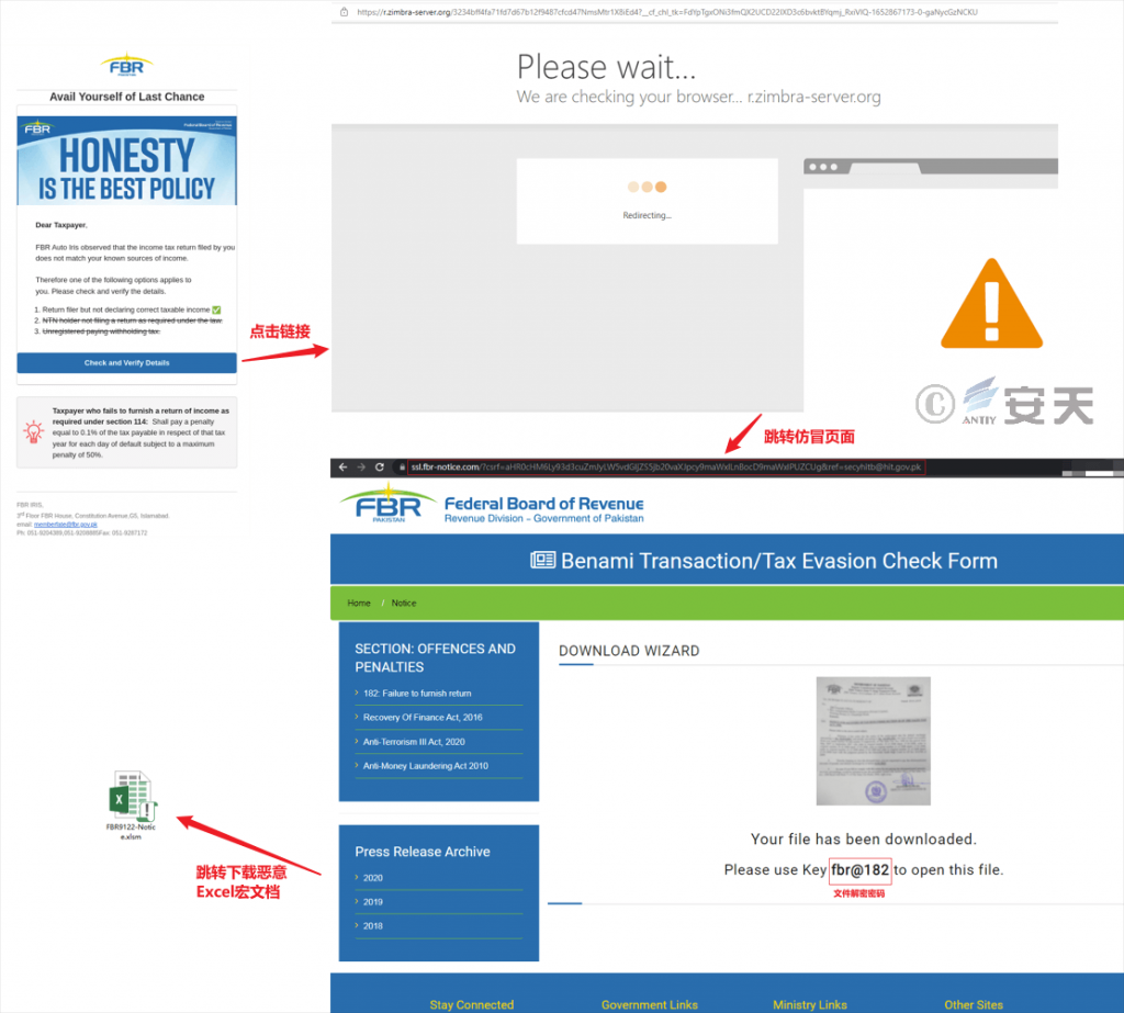 In the attack uncovered by Antiy CERT, the group was mainly disguised as Pakistani government workers delivering spear-phishing mail to targets. The target is tricked into downloading by the content of phishing email, and the document embedded with malicious macro code is opened, so that the target machine is implanted with open source Trojan-QuasarRAT, C + + backdoor Trojan-self-developed Trojan-horse, C # secret Trojan-stealing Trojan-horse and JScript download Trojan-horse.