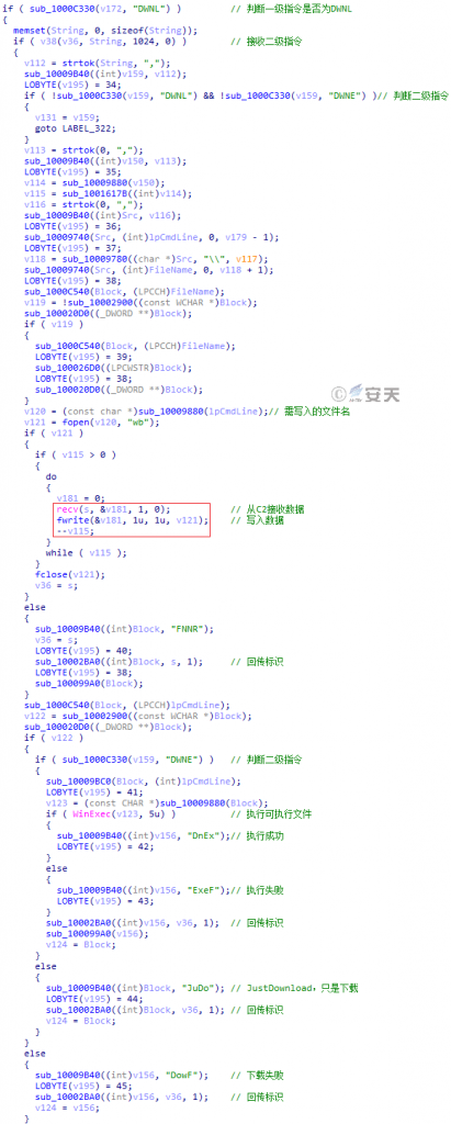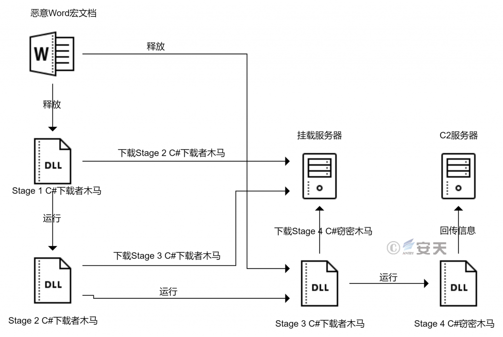 The attacker uses malicious Word macro document to release, executes Stage 1, Stage3 C # download Trojan horse, and then downloads the subsequent attack payload through the released download Trojan horse. At the same time, the attack payload returned by the server mounted by the attacker is essentially an ASCII file, and the download Trojan horse in each stage will convert the ASCII file into a binary file. It is then loaded into memory and jumped to a dynamic function for execution.