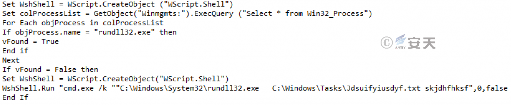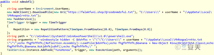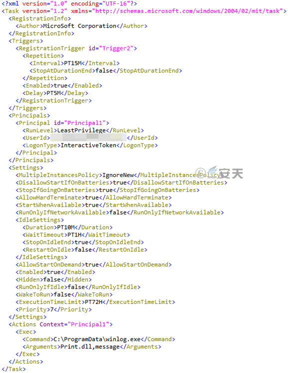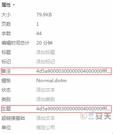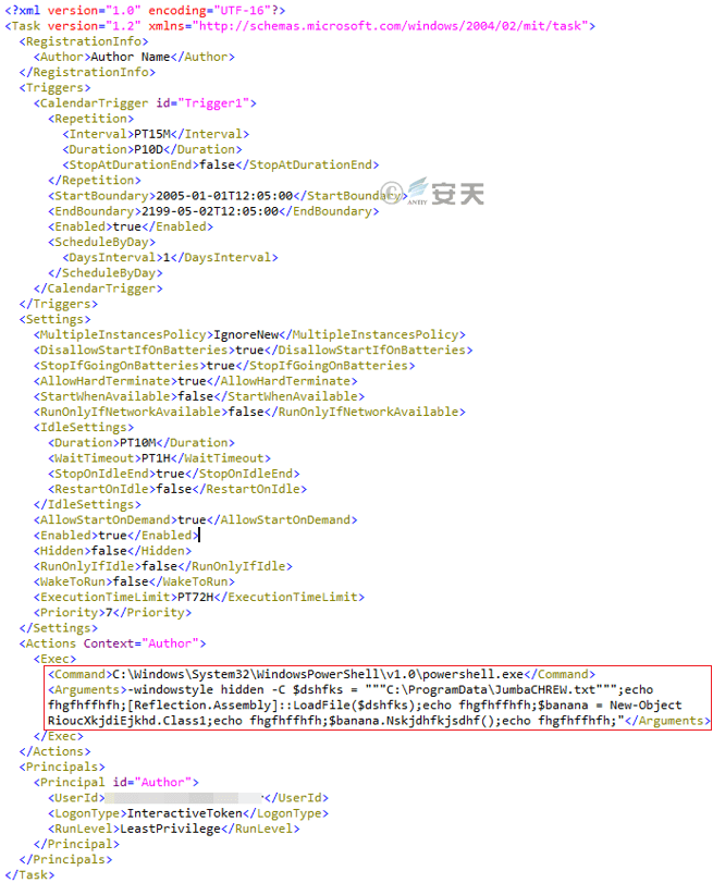 When the host computer has the installation folder of the antivirus software McAfee, the stage 3 C # download Trojan ASCII data is extracted from the “Comments” attribute in the document (in this sample, due to the fault of the attacker, The Trojan horse data is actually stored in the “Description” attribute of the document). After the ASCII data is converted into binary data, it is named “sdjfhkjsdh. txt” and released to the host machine% TEMP% directory, And create a scheduled task that is executed every twenty minutes for the released Trojan to persist.