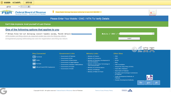 In August 2021, attacks were conducted using macro documents relating to the contents of the Pakistan Federal Tax Office tax declaration;