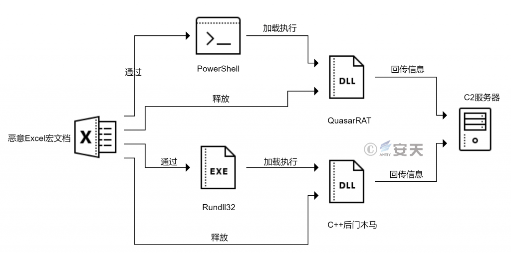 The attacker uses Excel documents carrying malicious macro code to release backdoor components (such as open source Trojan QuasarRAT, self-developed C + + backdoor Trojan) to the% ProgramData% directory of the host computer. In that case of open-source Trojan, the attack will use the system tool PowerShell to execute. For C + + backdoor Trojan, the attacker uses the system tool Rundl32 to execute.