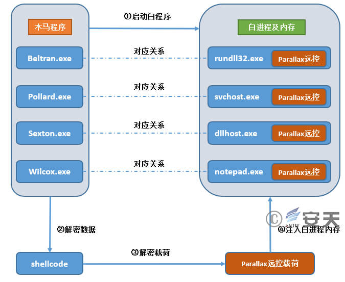 Four Trojan programs (Pollard.exe, Sexton.exe, Beltran.exe, and Wilcox.exe) are scheduled to launch as part of a scheduled task. Upon launch, they run their corresponding four white processes and simultaneously decrypt the same shellcode in memory. This shellcode then injects a contained PE data segment (ParallaxRAT remote control Trojan) into the corresponding white process. Beltran.exe controls the rundll32.exe process, Pollard.exe controls the svchost.exe process, Sexton.exe controls the dllhost.exe process, and Wilcox.exe controls the notepad.exe process.