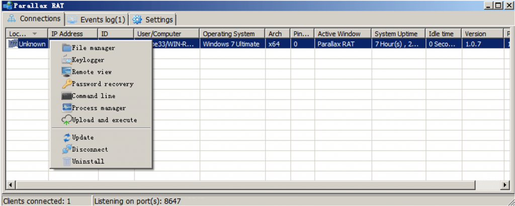 The PE data injected into the white process belongs to the Parallax RAT remote control trojan. While running in memory, it attempts to connect to the domain asianmedics.today, resolving to the IP address 23.160.208.250 and port 8647. Parallax RAT is a publicly available commercial remote control malware with capabilities such as file management, keystroke logging, remote desktop, password theft, command execution, process management, upload, and execution. Its functionality is mature and stable, sufficient to support standard espionage operations.