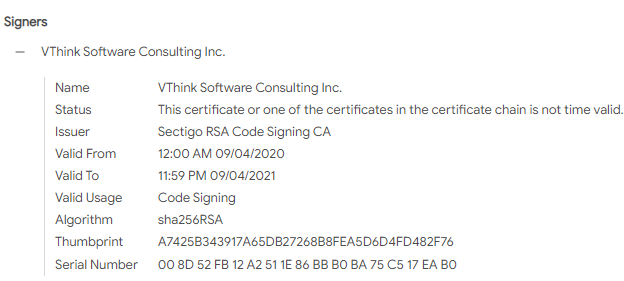 | Digital signature | Name: Information Civilized System Oy Valid From: 12:00 AM 01/13/2020 Valid To: 11:59 PM 01/12/2021 Thumbprint: 7FB3BF5C17D2E683653FC151ECC8A700DC226245 Serial Number: 00 97 DF 46 AC B2 6B 7C 81 A1 3C C4 67 B4 76 88 C8 Name: VThink Software Consulting Inc. Valid From: 2020-09-04 00:00:00 Valid To: 2021-09-04 23:59:59 Thumbprint: A7425B343917A65DB27268B8FEA5D6D4FD482F76 Serial Number: 8D 52 FB 12 A2 51 1E 86 BB B0 BA 75 C5 17 EA B0 |