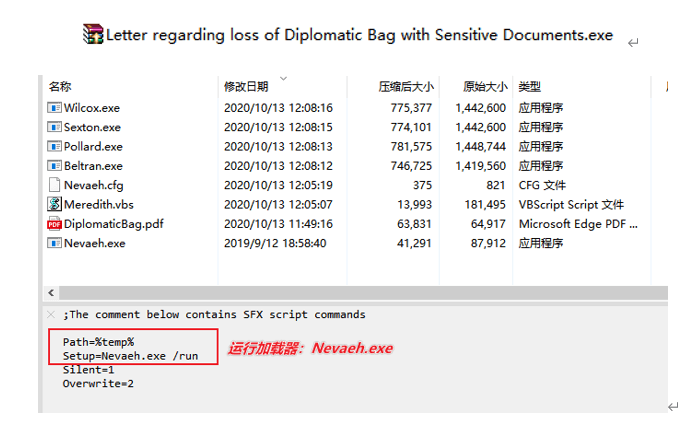 This link is a shared link of a foreign network disk. Click it to download a ZIP compressed package named “Letter regarding loss of Diplomatic Bag with Sensitive Documents.zip”. The package contains a self-extracting bait “Letter regarding loss of Diplomatic Bag with Sensitive Documents.exe” containing malicious code.