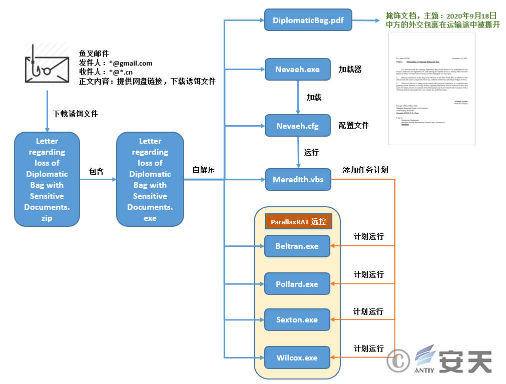 October 13 , 2020, a suspicious email was received in the mailbox of an important domestic unit. The sender used a Gmail mailbox and was not in the unit’s address book. The subject of the email was “Letter regarding the loss of a diplomatic package containing sensitive documents” and provided a network disk link for downloading the suspicious file in the body of the email.