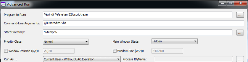 The loader Nevaeh.exe is actually the well-known automatic run tool Advanced Run, the attacker transmits parameters through the configuration file Nevaeh.cfg to silently execute the function script Meredith.vbs in the system’s temporary directory, as shown in Figure 3 ‑5.