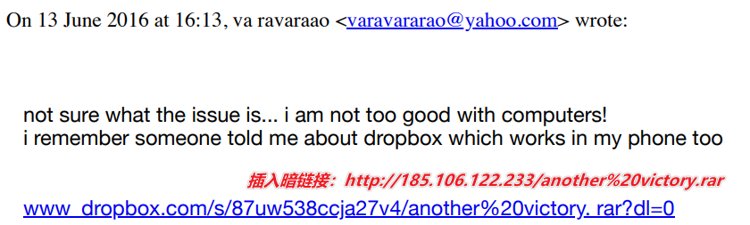 However, the Dropbox link in the text actually points to a hidden link, which actually downloads from the attacker’s server after clicking it.