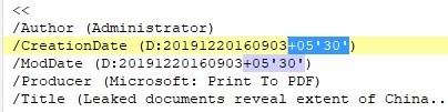 Because many attacks utilize commercial remote access tools, the effective timestamps of the malicious programs involved are often tampered with, making it impossible to infer the attacker’s geographic location based on normal time zone analysis. However, during the process of creating white-label documents, attackers often save HTML pages as PDFs through browsers. We have collected a few PDF samples that record the time zone of the suspected attacker’s machine: UTC+05:30.