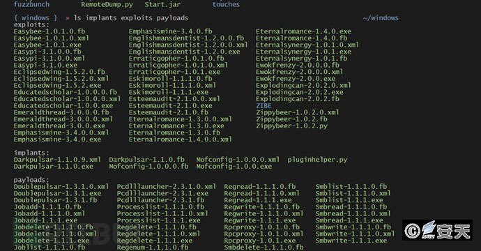 Fuzzbunker is a penetration, attack platform, responsible for using the vulnerability to implant the target host payload (generated by DanderSpritz), in the process of implantation can be directly memory executed, no entity files will be generated.