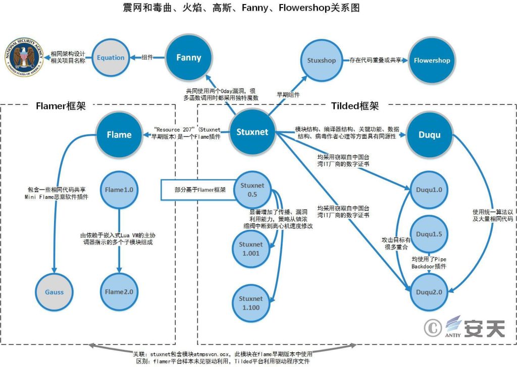 In a follow-up analysis of the Stuxnet in 2011, Antiy suggested the possible homology between the Stuxnet and the virus [2] [3]. Through the comparison of key code structure, key using method and code logic between virus and stuxnet worm, we find a lot of identical or similar code fragments, and prove our conjecture [4]. Antiy’s conclusion at that time was that “through the comparison of key code structure, key use method and code logic between virus and stuxnet worm, we found a large number of identical or similar code segments. This indicates that there is a code reuse relationship between the two, or that both are developed based on the same code framework. “But the question of whether the relationship to reuse or the development of the same framework was inconclusive at the time. Combining the later analysis results and progress of other organizations, it can be concluded that at least two malicious code frameworks, namely, Tilded and Flamer, have been maintained by the relevant A2PT attack organizations. Stuxnet, Toxic and Flame, and Gauss are developed based on the Tilded and Flamer frameworks respectively. On June 11, 2012, Kaspersky released a report that the earlier version of the 2009 version of the Stuxnet module (called “Resource 207”) was actually a Flame plugin. The result is a concatenation of two completely different frameworks, Flamer and Tilded. The malicious code based on these two frameworks has unique skills in infecting target systems and executing major tasks, both of which are used to develop different net-to-air attack equipment. Kaspersky concludes that the teams behind the two frameworks have shared the source code of at least one module, indicating that they have worked as a team at least once, and that they are two parallel projects belonging to the same institution [12]. Based on more clues, you can also string together Fanny and Flowershop with the above events, as shown in Figure 7.[2][3][4]Figure 7 Relationship between Shake-net and Toxic Warp, Flame, Gauss, Fanny, and Flowshop 7