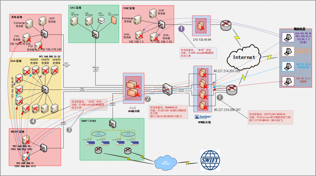 - Super border penetration ability. The United States is rich in vulnerabilities in network firewalls, routers, switches, VPNs and other network equipment, and has complete tools to access control boundaries and network equipment and forward traffic. And this will be used as a relay station to continuously attack the internal network target. For example, in the attack on EastNets, the largest S WIFT service provider in the Middle East, the US broke through the external VPN firewall and the intranet enterprise firewall successively, and installed the traffic forwarding Trojan horse on the firewall.