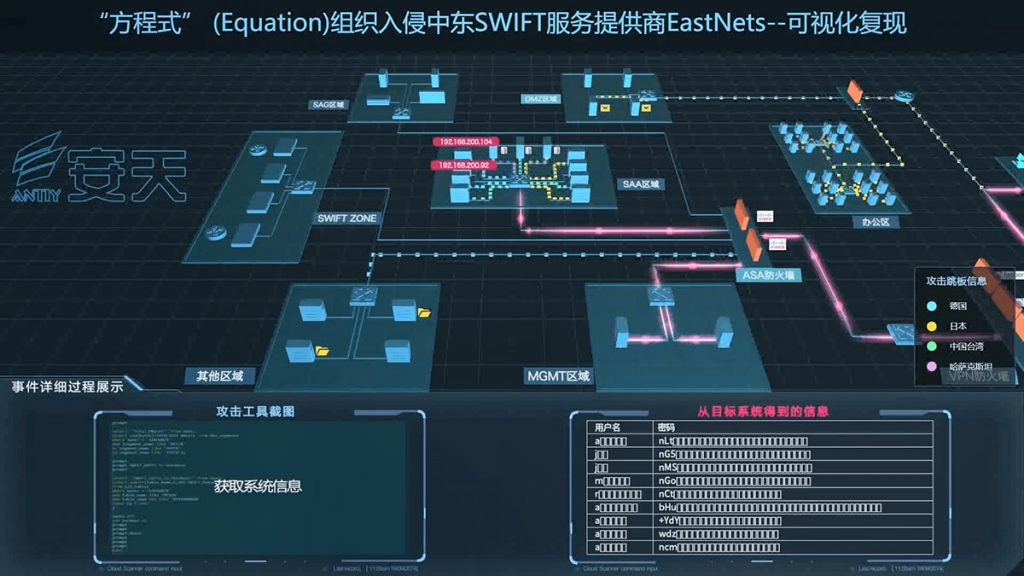 In 2019, Antiy first introduced the process of Formula Group’s attack on EastNets, the Middle East financial services agency. This is a new result of Antiy’s combination of historical analysis of the Formula Organization with leaked data from the “Shadow Brokers.” In the same year, Antiy officially released the Recovering Analysis Report on “Equation Group” Attack on SWIFT Service Provider EastNets [12], which accurately restored the panorama and topology of IT assets affected by the attack. The whole process of the killing chain was completely reappeared, and the weapons used in the operation and the operation process were thoroughly combed and visualized.[12]