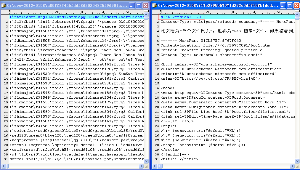 In the case of MHT files, The CLSID will not be stored in the DOC document, but directly in the MHT file (as shown in the red box in Figure 3-4), which can evade the detection of most security software. In addition, the encoding format has changed, so if you use CVE-2012-0158 detection program that was previously written based on the RTF file, it will be invalid.