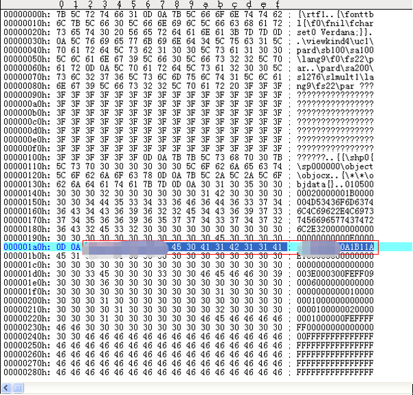 If attackers use RTF files to trigger this vulnerability, CLSID will appear in the file after decoding (CLSID is the unique ID that the Windows system assigns to different applications, file types, OLE objects, special folders, and various system components). If MHT files are used, CLSID will appear in the MHT file – since the previous RTF overflow vulnerability embedded in DOC documents (Figure 3-2, the red box is the DOC file’s header), CLSID is stored in the DOC document (Figure 3-3, the red box is CLSID, one part uses the network byte order, and the other part uses the host byte order).