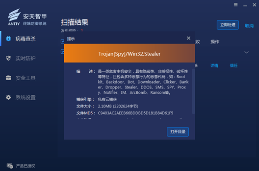 It has been verified that Antiy Intelligent Endpoint Protection System (IEP) can effectively detect and kill this data-stealing Trojan.