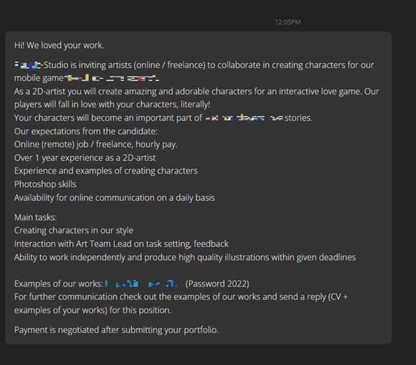 Attackers masqueraded as mobile game development company PlayMe Studio staff recruited and invited NFT artists to create characters for their mobile games.