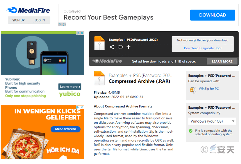 The attacker sent a link to the victim, claiming it was a sample of their work. The link led to a download page on the file-sharing website MediaFire, where the download content was an encrypted compressed file.