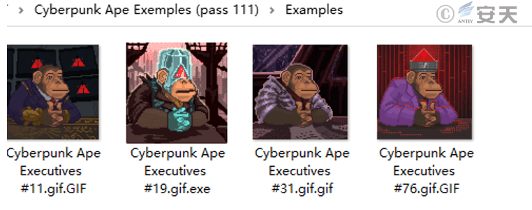 The attacker also sent a short link to the victim under the pretext of a work example. The short link redirected to a MEGA download page. The download content was an encrypted compressed package containing multiple NFT works of the “Cyberpunk Ape Executive” project and a stealing Trojan disguised as a GIF image.