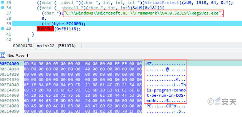 The Shellcode function is to create a RegSvcs.exe process and inject the decrypted payload into the process.