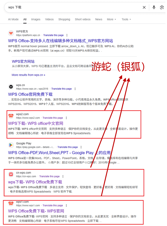 Google search for “WPS download” shows that the 3rd, 5th and 6th digits of page 1 are all fake phishing websites created by the “SwimSnake” organization, and the result is as follows: