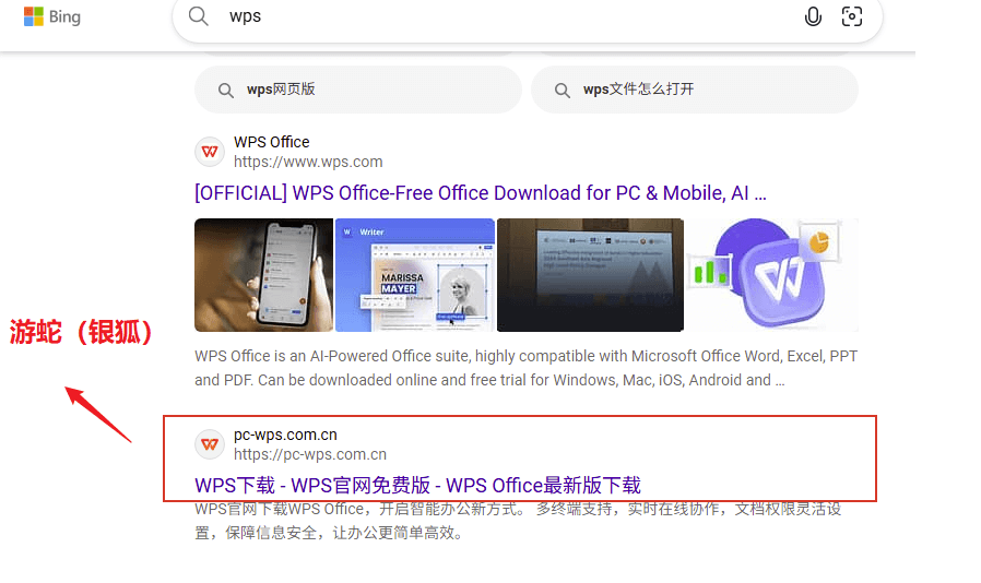 A bing search for “WPS” shows that the third digit on page 1 is a fake phishing website created by the “SwimSnake” organization, and the result is shown in the figure below: