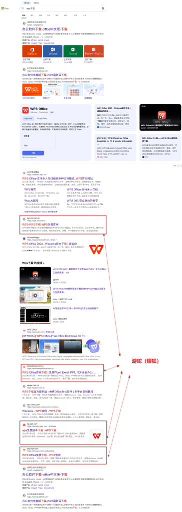 A search for “WPS download” on Bing’s web page shows that the 4th, 7th, 10th and 11th digits of Page 1 are all fake fishing websites created by the ” SwimSnake” organization, and the result is shown as follows:
