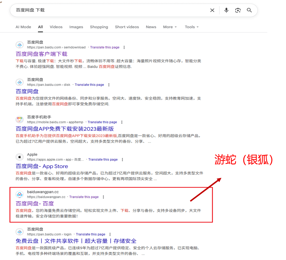 The “SwimSnake (Silver Fox)” phishing website attack uses Google search engine SEO techniques to make its fake download websites rank higher in search results. To identify these fake websites, please refer to Antiy’s previous analysis report, “The SwimSnake Cybercriminal Group Distributes Remote Access Trojans by Leveraging Counterfeit WPS Office Download Sites”, for phishing website identification and prevention.
