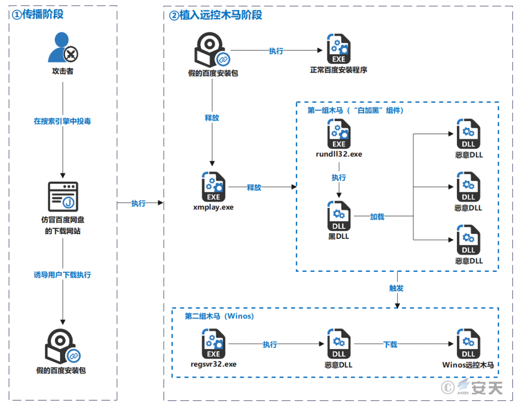 Antiy CERT recently detected the “SwimSnake (Silver Fox)” gang targeting social media tools such as WeChat and DingTalk with precise malware attacks. This gang uses a fake Baidu Netdisk installation package to deliver malicious payloads that have been upgraded to bypass antivirus detection. To evade security software detection, the gang abandoned its traditional method of loading malicious DLLs in the same directory, instead abusing Windows system executables such as rundll32.exe and regsvr32.exe to load malicious modules and release two sets of Trojan programs with different functions. This attack employs a triggered deployment strategy: when an infected device is detected to have instant messaging processes such as WeChat, DingTalk, Telegram, or WhatsApp, a WinOS remote access Trojan is released. This Trojan allows for remote access of the infected device, leveraging the social attributes of these chat tools to initiate actions such as adding users to groups and targeted forwarding, achieving efficient internal spread rather than indiscriminate deployment. This strategy improves the efficiency of attack propagation and reduces the likelihood of being detected by security products through a precise triggering mechanism. If the device does not have the aforementioned chat tools, only another set of basic functional Trojans is deployed, responsible for maintaining communication with the remote C2 server, downloading malicious components, and transmitting relevant device information back.