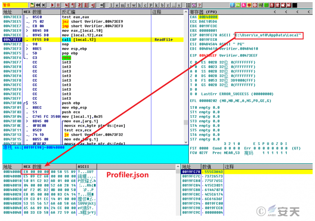 The malicious component Verifier.exe first reads the Profiler.json file in the same directory and decrypts it into shellcode.