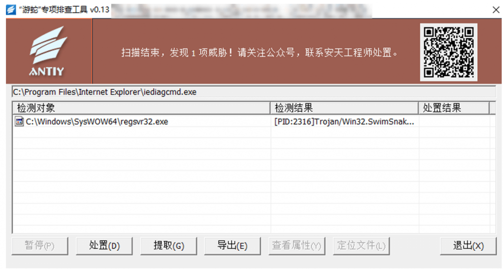 To more accurately and comprehensively eliminate threats on compromised hosts, customers can contact the Antiy Emergency Response Team (cert@antiy.cn) after detecting threats using specialized screening tools.
