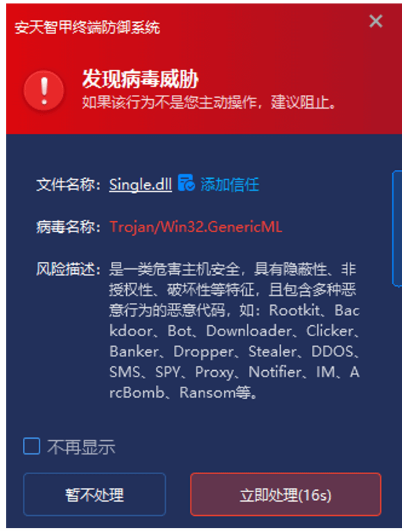 Antiy Intelligent Endpoint Protection System (IEP) has a driver-level main defense module, which, based on the detection capabilities of AVL SDK and defense points at the kernel and application layers, can effectively block the operation of this remote access Trojan.