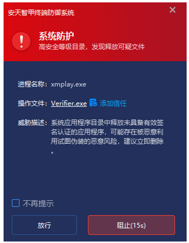 Furthermore, IEP’s proactive defense capabilities monitor local process behavior in real time, tracking and analyzing abnormal file releases, file operations, command execution, abnormal behavior, and network activity. It immediately intercepts any high-risk behavior detected. In this incident, IEP immediately issued an alert when xmplay.exe released files to a sensitive directory.