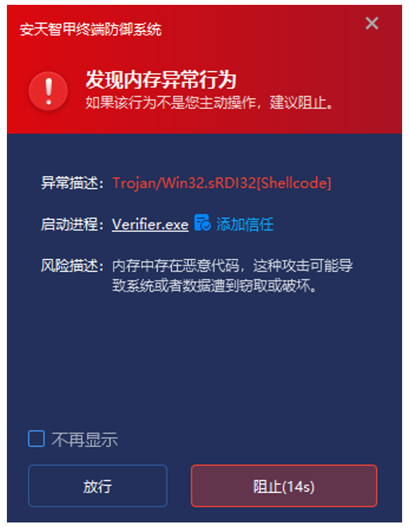 IEP also features memory protection capabilities, enabling real-time monitoring of the memory environment, detection of data in memory, and interception of abnormal memory operations. In this incident, IEP was able to immediately intercept the execution of shellcode by the file Verifier.exe.