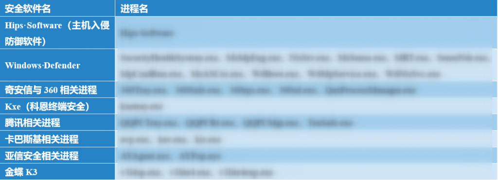 Traverse the processes and detect the following security software process names, then terminate any processes currently listed in the table.